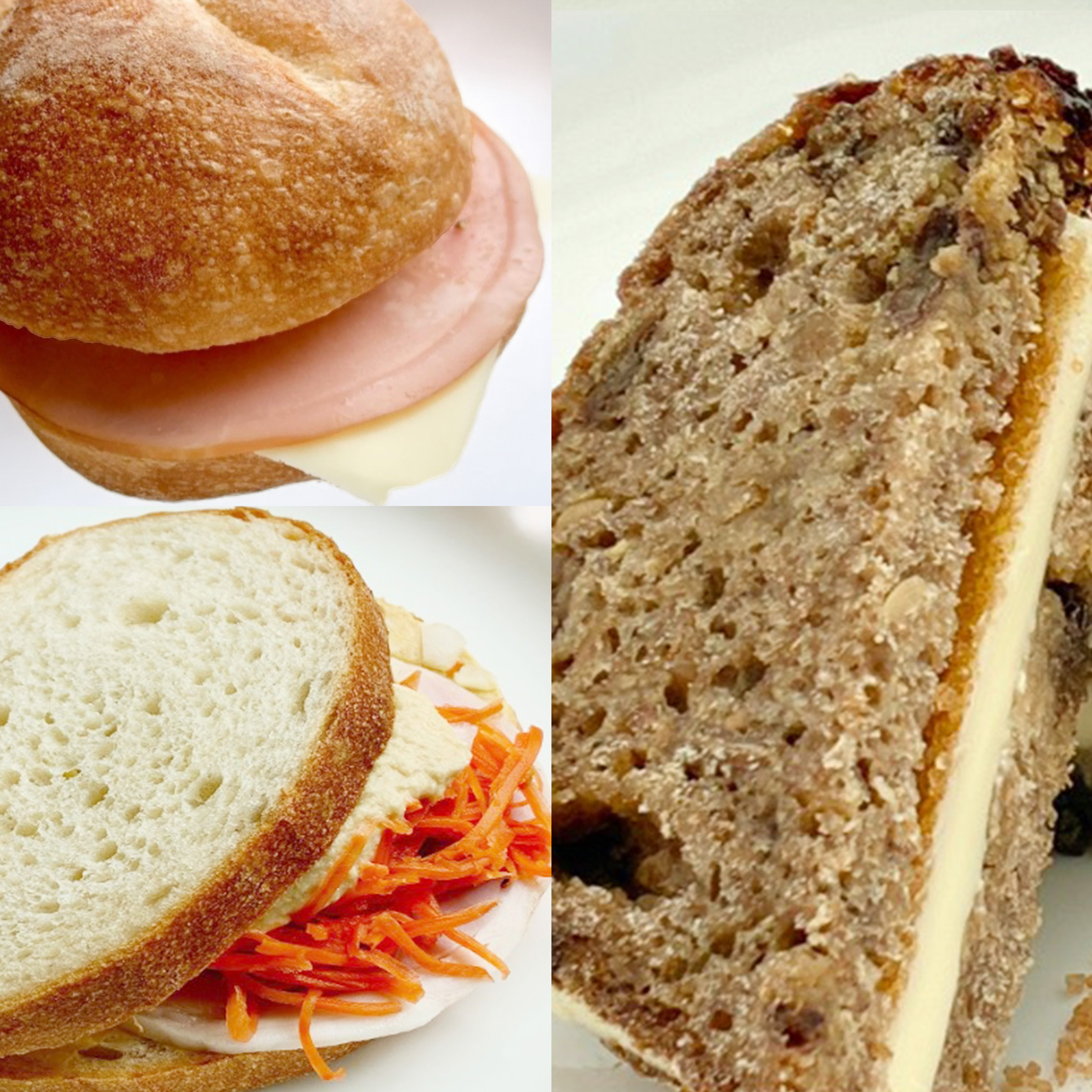 ①豆のペーストと人参サラダとハムの白パンサンド